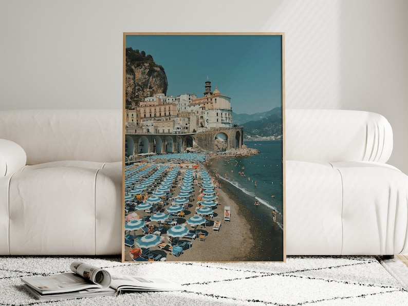 Immerse yourself in the serene beauty of the Amalfi Coast with our captivating “Amalfi Beach” physical poster. This stunning artwork captures the essence of this iconic Italian destination, featuring the azure waters, golden sands, and pastel-colored buildings that line the coastline.
